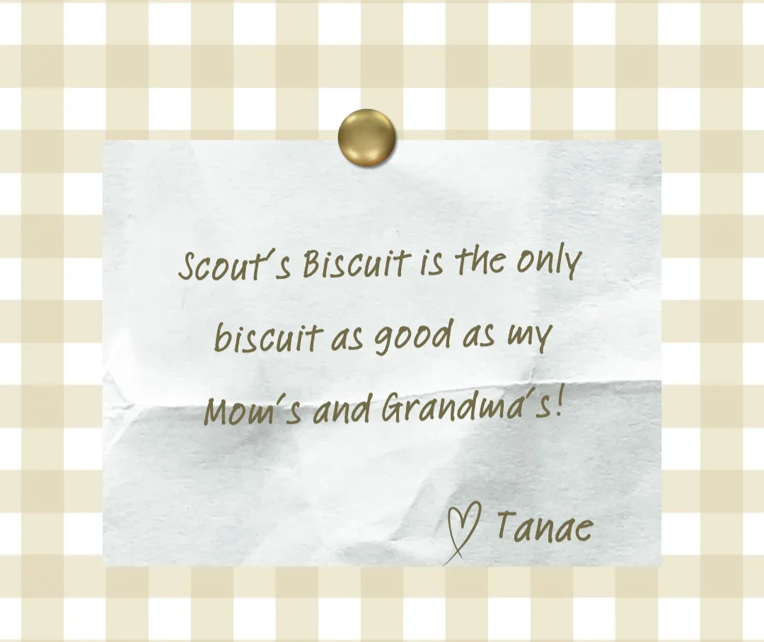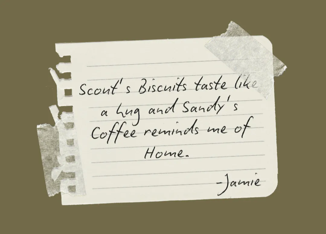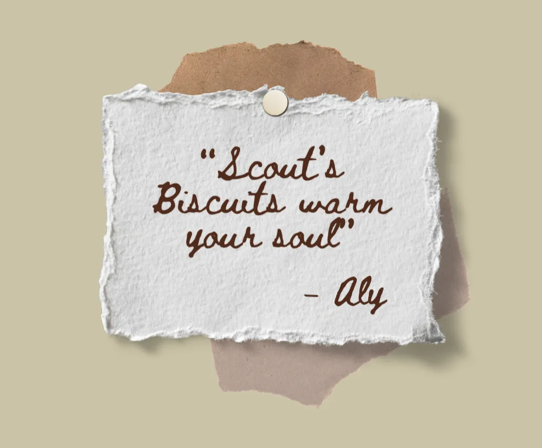 Today, Scout's is founded on faith in God and a commitment to our community. We believe food is more than a meal - it is a way to care for people. With every biscuit we bake, we honor Jesus Christ our Lord and Savior, serve our neighbors with grateful hearts, and share the warmth that first inspired us decades ago.